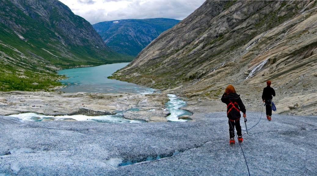 The Jostedalsbreen glacier is the largest on the European continent. From the large glacier plateau smaller glaciers slowly slide down valleys and rock faces, and many of them are easily reached from the Jostedalen valley. Nigardsbreen (red route on map) roughly translates into “nine farms glacier”, and got its name after the glacier advanced and demolished nine farms during the “small ice-age”.