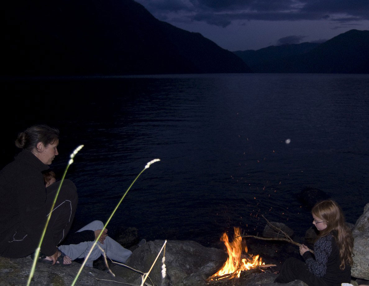 Bålet holder knotten unna. The campfire keeps the midges away.