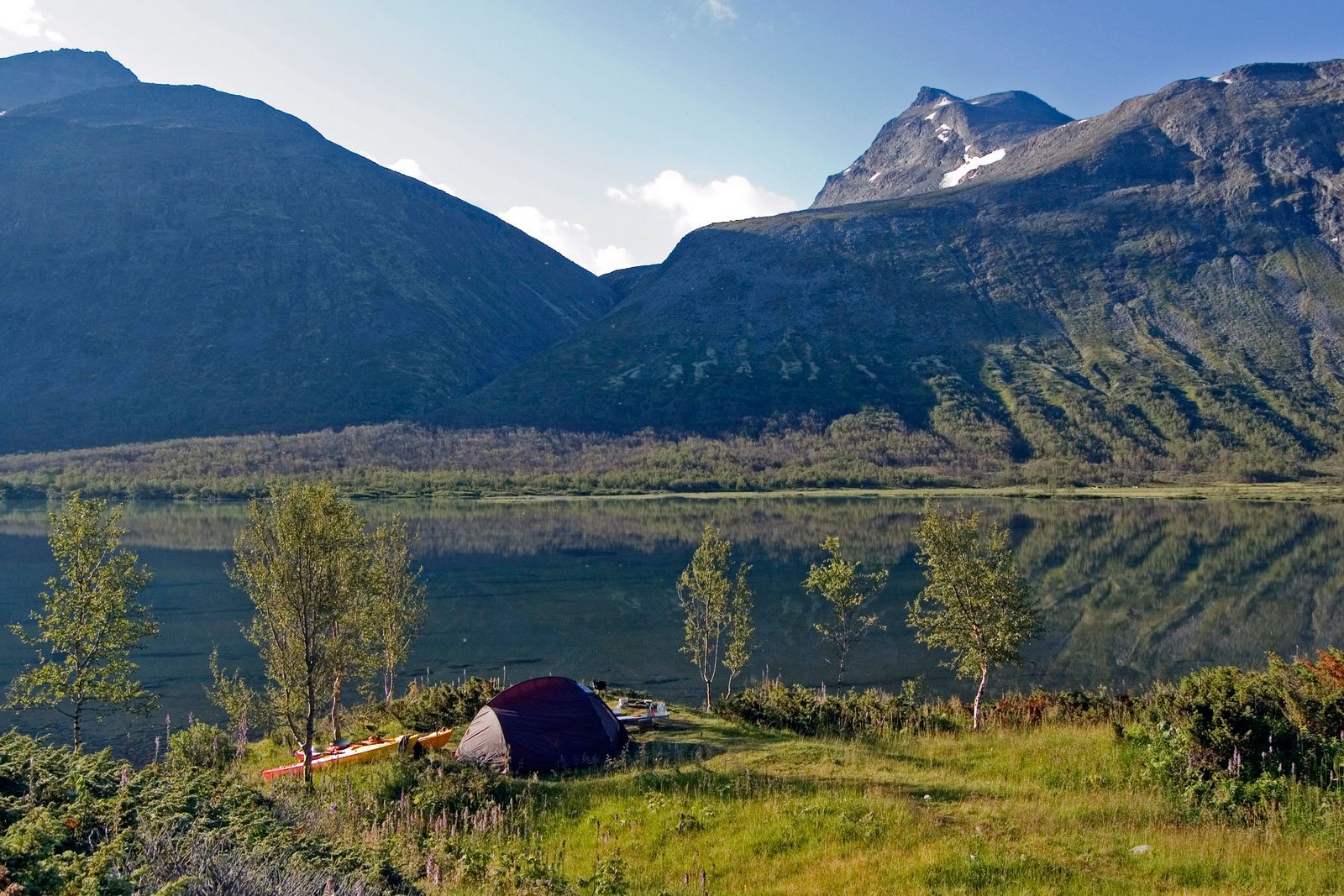 Teltplassen med utsyn mot Svartdalpiggen. Campsite by the Gjendebu staffed lodge.