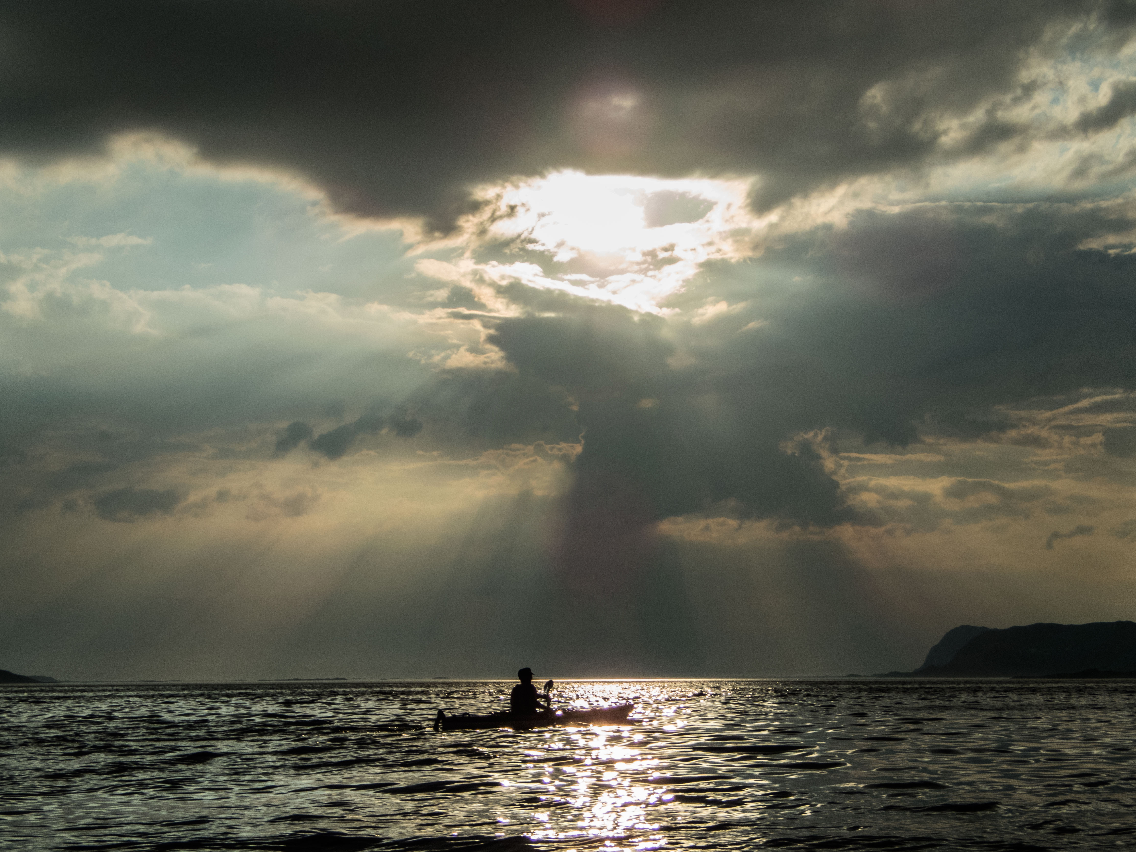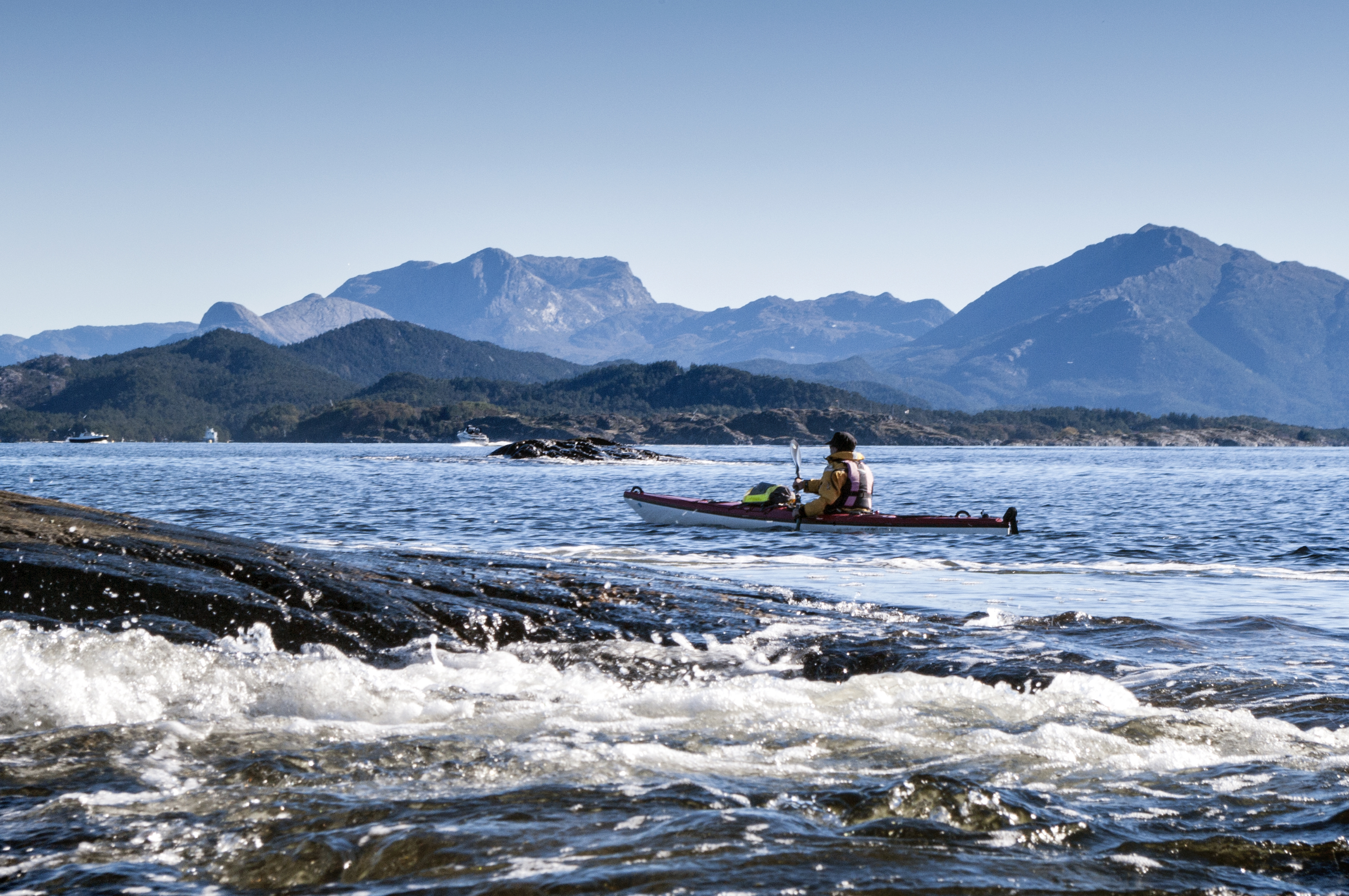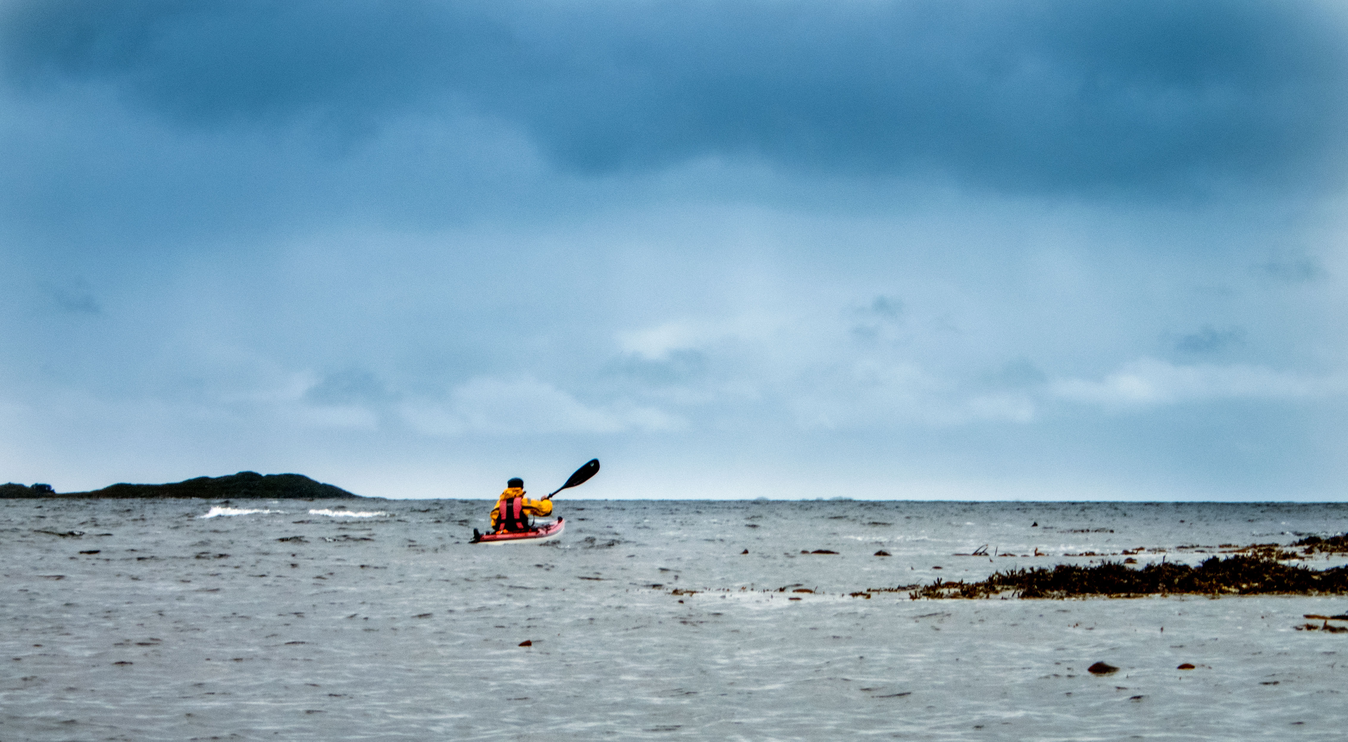Skydekket hang lavt denne helgen, men tørrdrakter holder regnet ute …. Med vanntett kamera prøvde vi ut litt lavere kameravinkler som gir mer fokus på vannet og kajakken enn på det større landskapet.