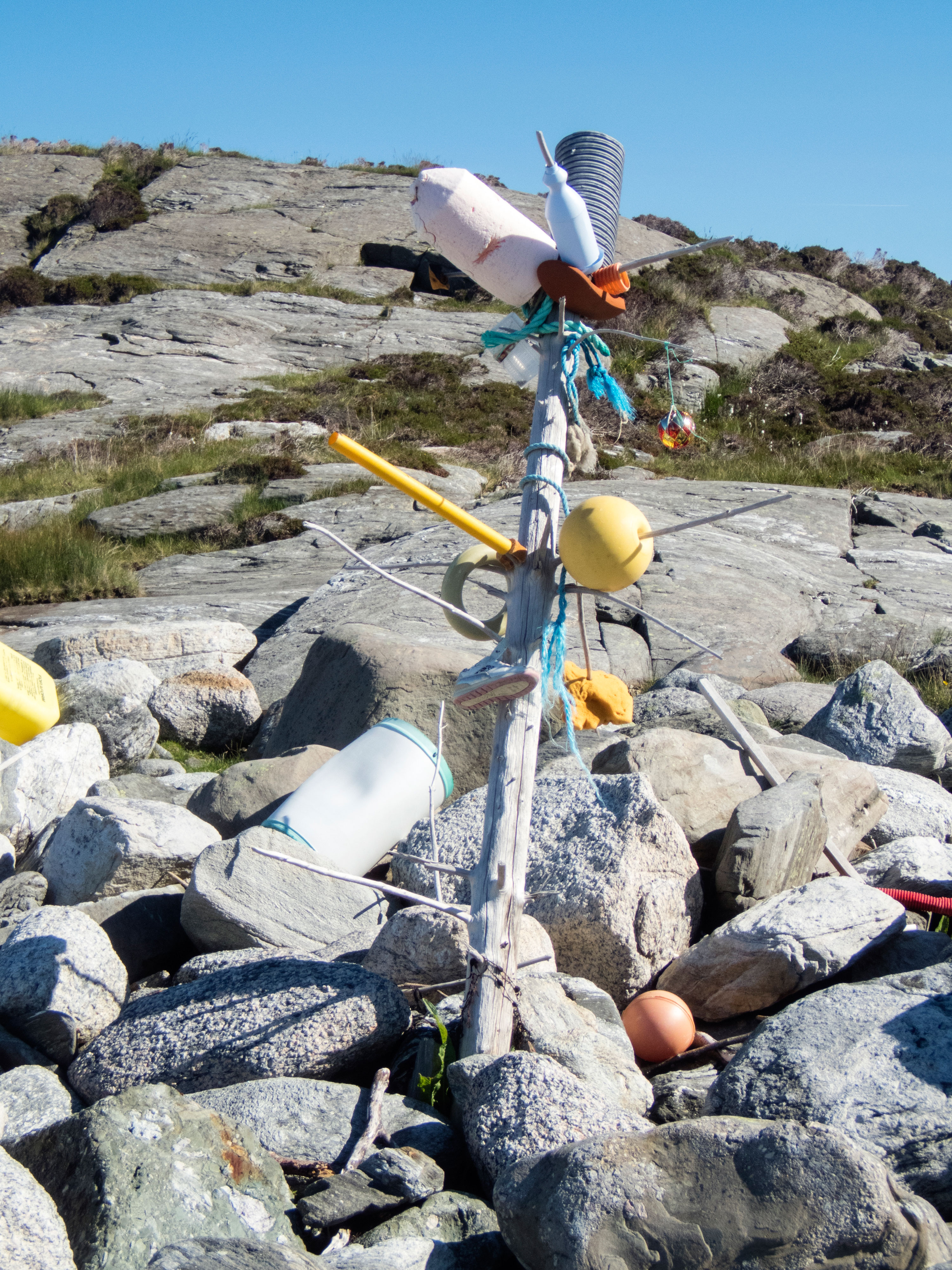 Lenger oppe, også over flomålet ligger menneskenes bidrag til mikroladskapet i form av plastboss, som av vittige sjeler er konstruert som et fugleskremsel, eller kanskje en advarsel til alle og enhver om marin forsøpling.