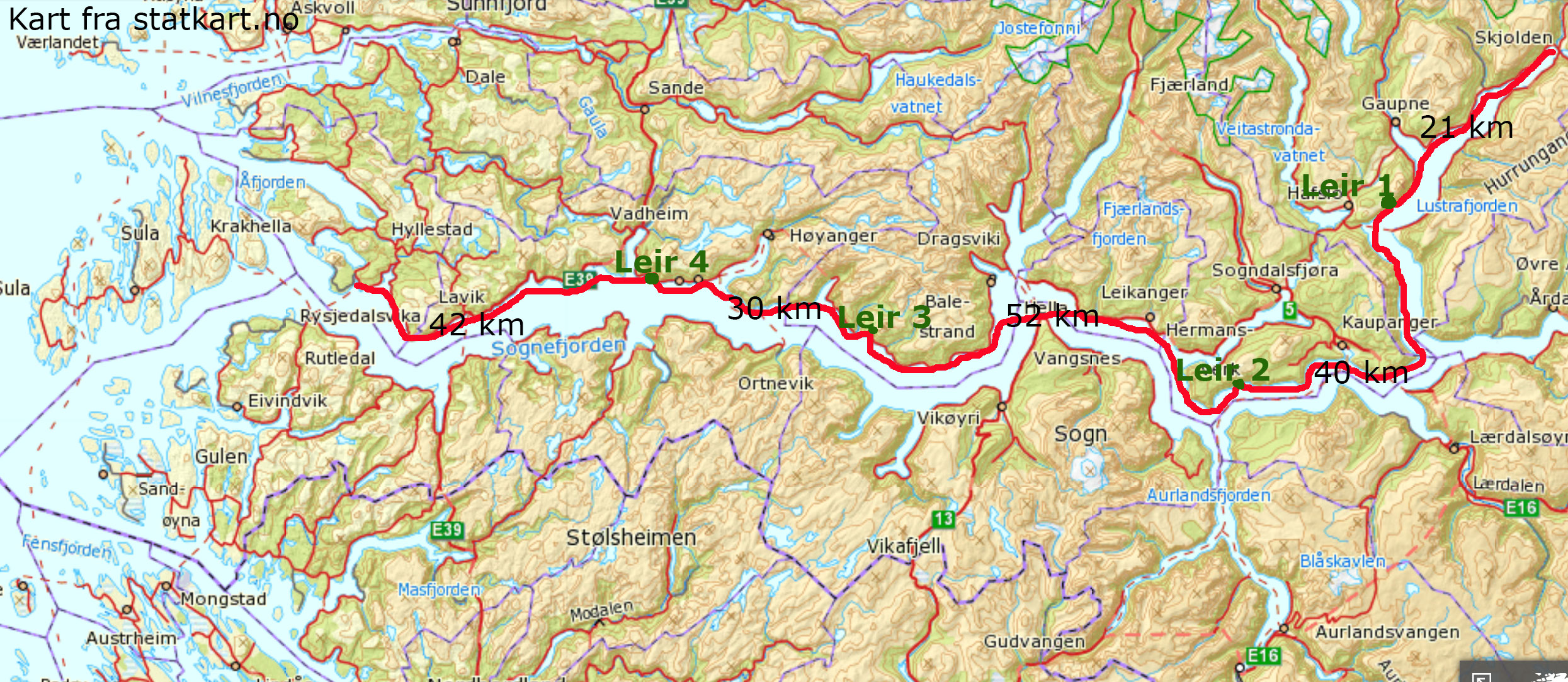 Turen er “Sognefjorden på langs” og innbyr til tempo og effektivitet. Men tar du deg tid er det flere flotte sidefjorder og steder både på nord- og sørsiden av fjorden. Langs ruten vi padlet, kunne vi: